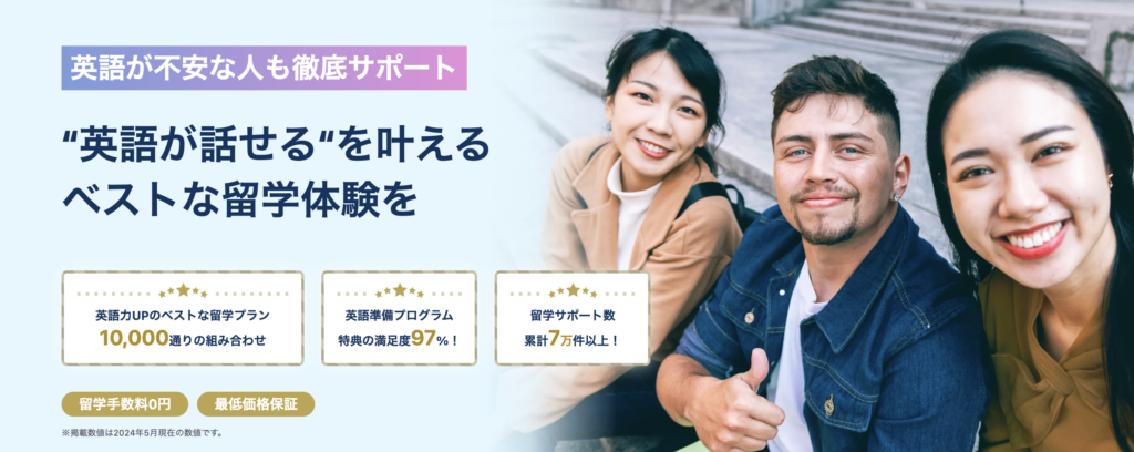 School Withは留学先や語学学校を検索し、複数の選択肢から自分に合う留学プログラムを選べるサービスです。フィリピン留学をはじめ、都市や学校ごとに情報を比較でき、オンライン相談や手続きのサポートもあります。選択肢の幅が広く、語学学校の特徴や費用、地域ごとの違いを比較しながら選べるように工夫されています。短期留学から長期プランまで対応しており、目的別に学びたい内容を見つけられる点が特長です。