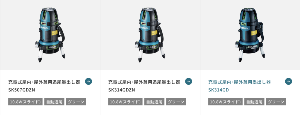 マキタはレーザー墨出器の製品一覧を提示しており、電動工具メーカーとして現場導入の流れを想像しやすいのが特徴です。比較では「電源をどう運用するか(現場での充電・予備・持ち替え)」という観点が作りやすく、工具類とあわせて運用の手間を減らしたい人に向きます。レーザー墨出し器は本体性能だけでなく、持ち運び・設置・調整を含めた運用が満足度に直結しやすいので、使用頻度が高いほど「現場の流れに馴染むか」を意識して検討すると失敗が減ります。