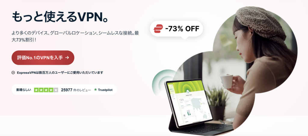 ExpressVPNは、世界中にサーバー拠点を持つVPNサービスで、通信の安定性を重視した設計が特徴です。海外のコンテンツ利用や、公共Wi-Fi利用時のセキュリティ対策など、幅広い用途に対応しています。アプリは日本語表示に対応しており、パソコン・スマホ・タブレットなど複数デバイスで利用できます。操作画面がシンプルなので、VPNを初めて使う人でも設定しやすい点が評価されています。また、通信の暗号化やログ管理ポリシーなど、プライバシー面の配慮もされています。速度と安定性のバランスを重視したい人に向いたサービスです。