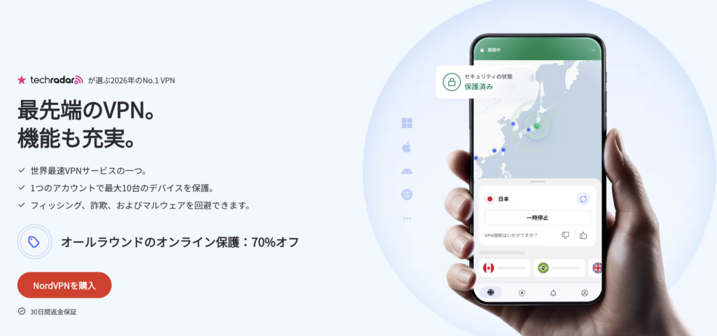NordVPNは、世界中に多数のサーバーを展開しているVPNサービスです。通信速度と接続安定性の両立を意識した設計で、動画視聴やリモートワークなど幅広い用途に使われています。専用アプリは日本語に対応しており、操作も比較的シンプルです。セキュリティ機能も充実しており、データ暗号化や不審な通信を防ぐ仕組みが備わっています。利用者数が多く、情報量が多い点も特徴で、VPNの仕組みを学びながら使いたい人にも向いています。
