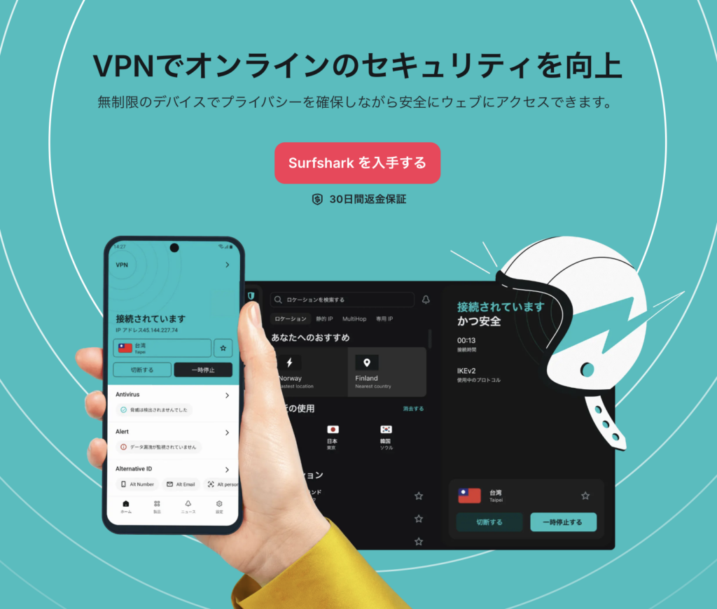 Surfsharkは、複数端末で同時に利用できる点が特徴のVPNサービスです。家族や複数デバイスで使いたい人に向いており、スマホ・パソコン・タブレットをまとめて管理できます。アプリは日本語表示に対応しており、設定も比較的簡単です。広告ブロックやセキュリティ機能も搭載されており、日常利用を快適にしたい人に配慮されています。コストを抑えつつ、複数端末で使いたい人に向いたサービスです。