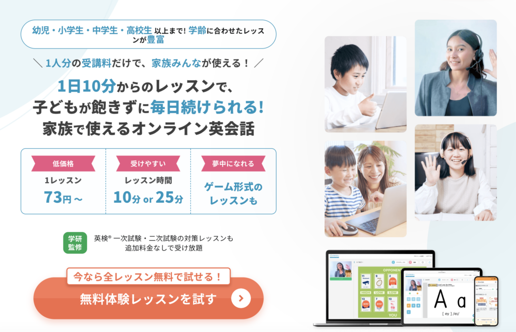 家族でシェアできるオンライン英会話サービスです。1アカウントで最大6名まで受講可能で、それぞれの学習レベルに合わせた教材から選べる点が特徴です。短時間(10分/25分)から選べるレッスン形式が用意されており、子どもの毎日の学習習慣形成にも向いています。ゲーム形式のレッスンもあり、楽しみながら英語に触れられる仕組みも提供されています。