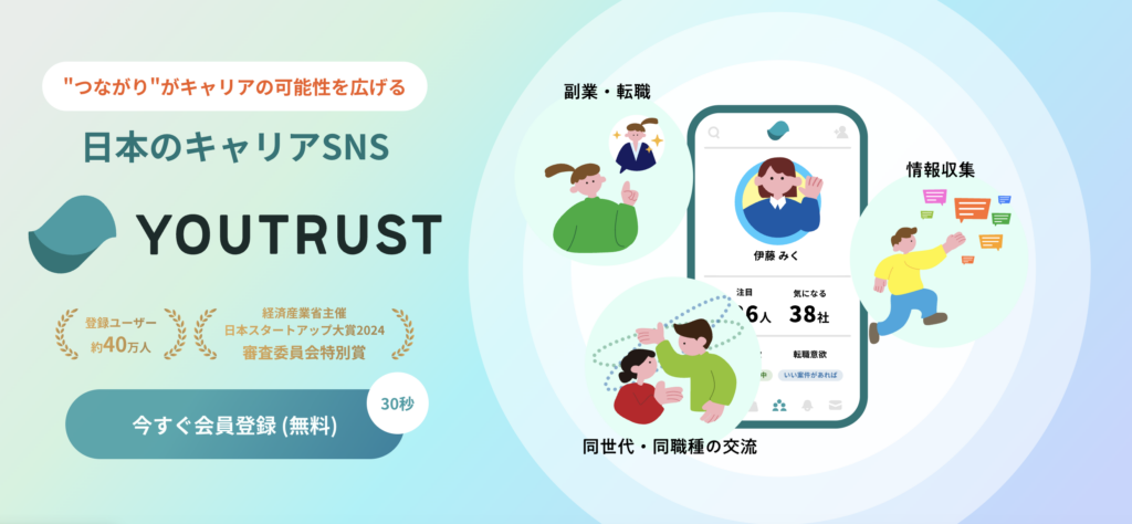おすすめコメント:転職か現職継続かで迷っている、または副業も含めて選択肢を広げたい人は、つながりを作りながら情報を集め、必要なときに動ける状態を作ることが大切です。YOUTRUSTは「今すぐ転職」だけに寄り過ぎず、相談・学び・コミュニティなどを通して関係を育てやすいので、慎重に次の一手を考えたい人にも向きます。まずはプロフィールを整え、興味領域のコミュニティや話題を追うところから始めると使い方が定まりやすいです。