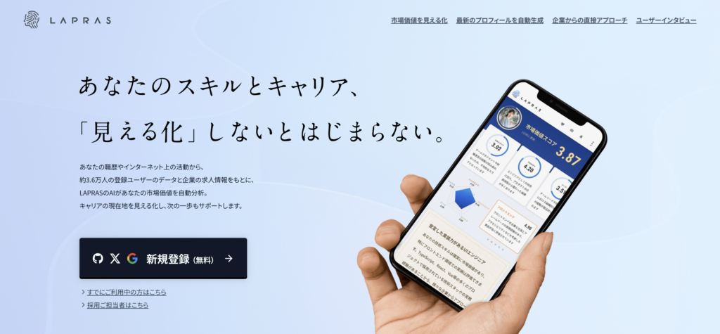 おすすめコメント:スキルベースでキャリアを伸ばしたい人は、「何ができるか」を第三者に伝わる形で整えることが最優先になります。LAPRASは、その整理と見せ方に寄せた運用がしやすく、合う企業との接点づくりを効率化しやすいです。まずは公開できる実績・関心領域・得意分野をまとめ、どんな働き方(転職/副業/業務委託)を視野に入れるかを決めると活用が具体化します。