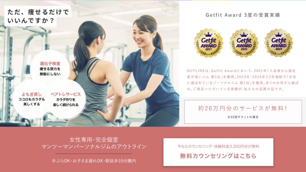 OUTLINE(アウトライン)は、完全個室・女性専用のパーソナルジムとして全国に展開しています。